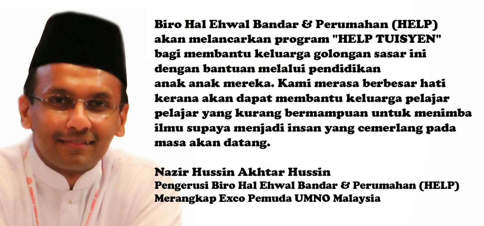 Biro Hal Ehwal Bandar & Perumahan (HELP) Pergerakan Pemuda UMNO Malaysia akan melancarkan program "HELP TUISYEN" dengan mengutamakan golongan sasar yg terdiri pelajar pelajar tingkatan 5 yang akan menghadapi peperiksaan SPM pada tahun ini. Program ini kita halusi hasil ilham dari isu permasalahan utama bandar iaitu "Isu Kos Sara Hidup"@ Kemiskinan Bandar".